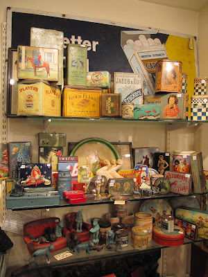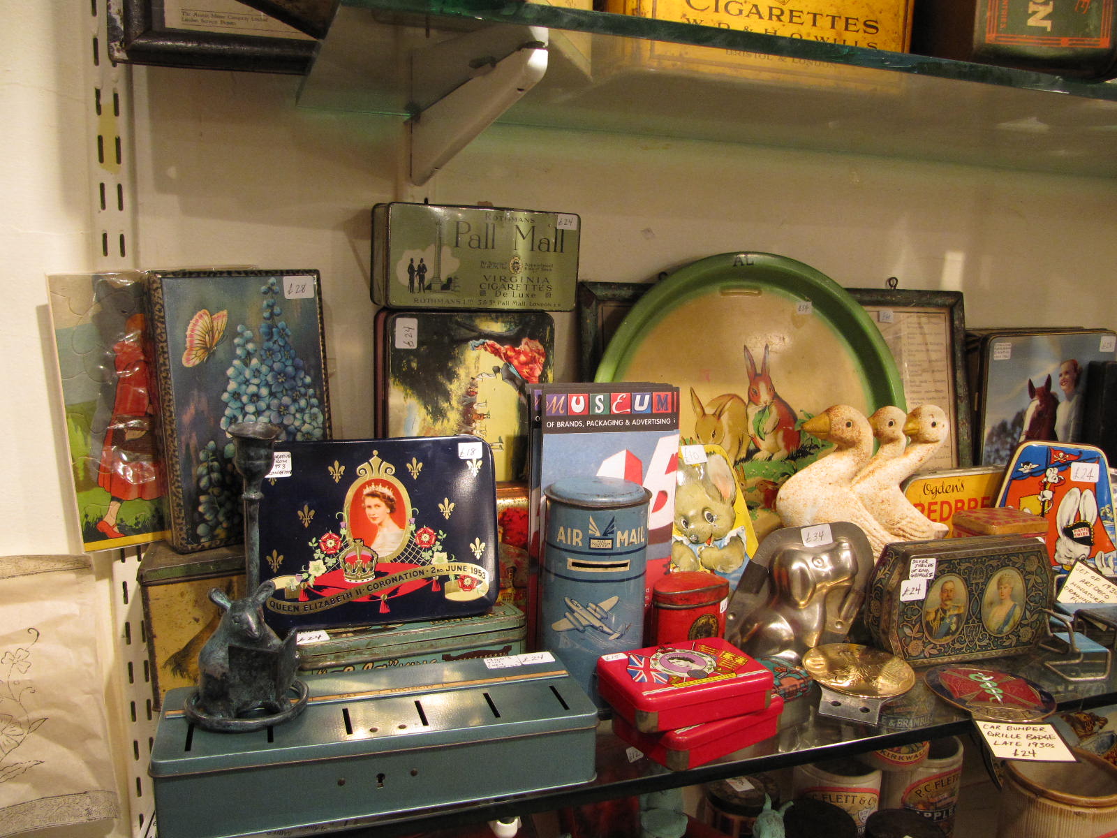 (note the Queen Elizabeth coronation tins, flamingo tin, Players tin, and George V silver jubilee tin...)