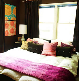 There are a lot of elements that I like about this bed(room).  First off, the warm dark brown walls and curtains with the colourful prints.  Then there's the most important element- the plush, comfy duvet in a beautiful cream to offset the darkness in the room.  I also like how the homeowner threw in punches of colour with throws and pillows.