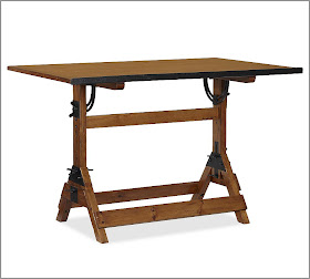 I saw a much more simplified (completely wooden) version of this drafting table at an antiques fair on Tuesday. It was far too big, though I did contemplate it for awhile. Instead, I've decided that we are fully capable of making one...
