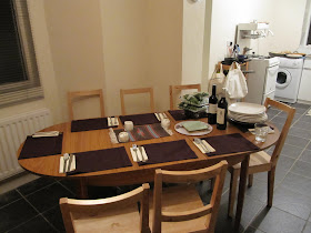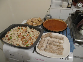 There was lots of prep for dinner. We started cooking around 3pm after a final trip to the Co-op and didn't stop until dinner around 8pm. Here you can see the Pumpkin Pie (first to be made so it could cool), Biscuits, Stuffing waiting to be put in the oven, and homemade veggie sausages ready to fry!